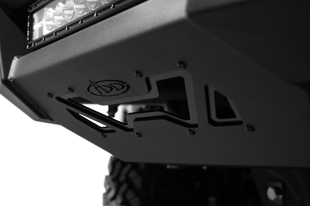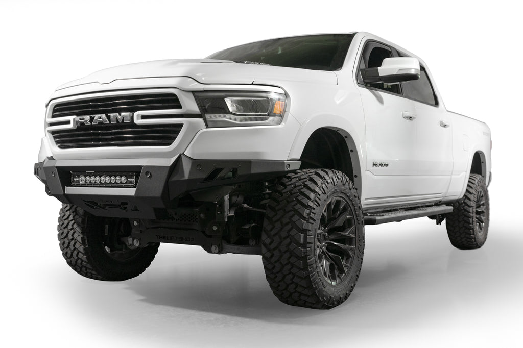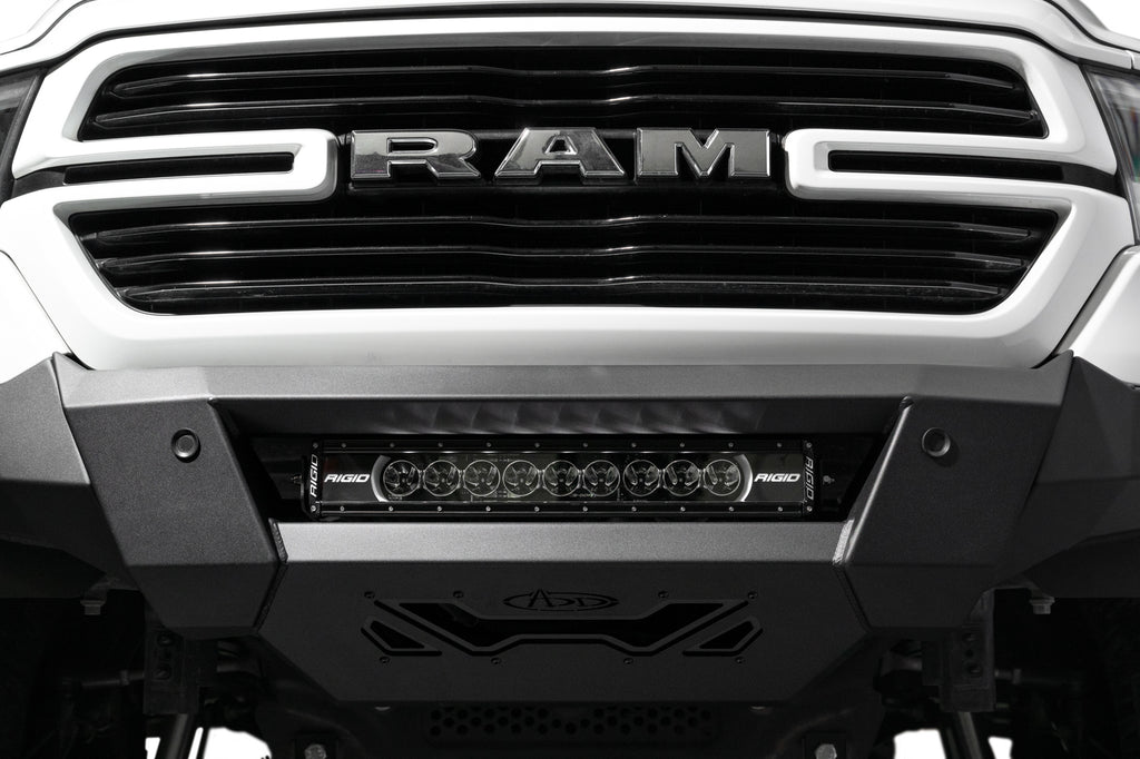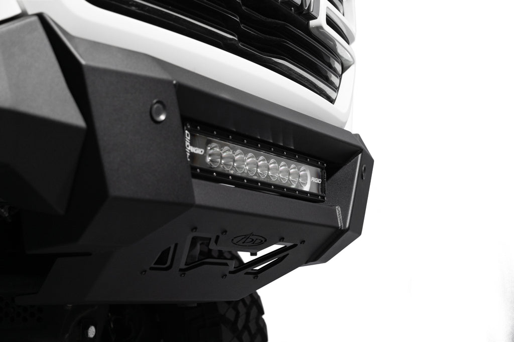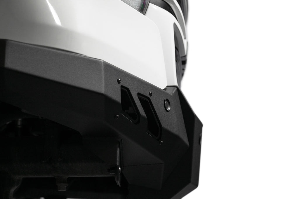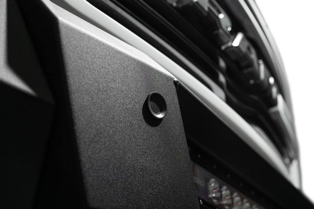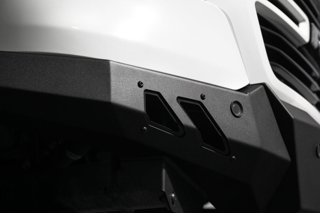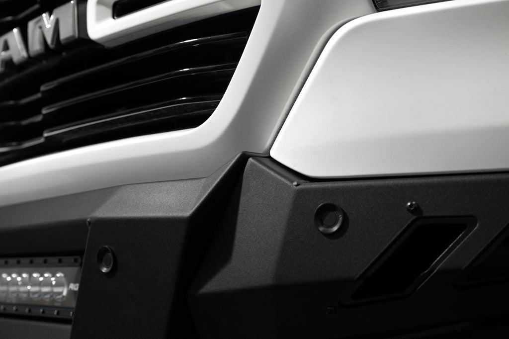 Our front bumper features a low-profile design and tight fitment. The center mount is compatible with one 20-inch LED light bar. The bumper is finished in a 2-stage hammer black powder coat, and it features satin black accent panels. The OEM parking sensors are retained. The bumper is made from steel, and it is fully bolt-on. Made in the USA.