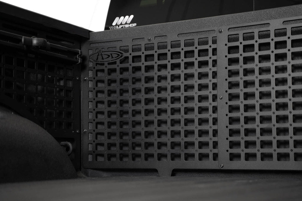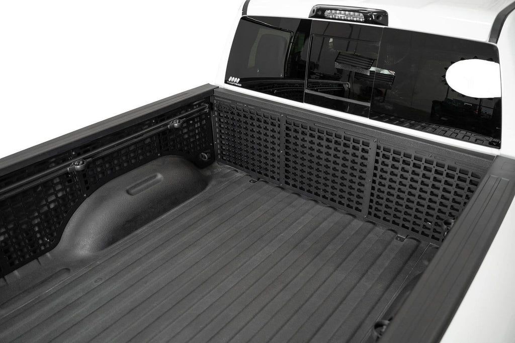 Our Bed Cab Molle Storage Panels are the ultimate cargo solution for those who need effective truck bed storage solutions. Our Molle Panels provide a versatile platform for attaching and organizing your trail gear. They are compatible with a range of attachment systems including quick fist mounts, molle straps, bolts, and other tactical solutions. The panels were designed to closely follow the contours of the truck bed, with a fitment unrivaled by others. The factory tie down points are retained, and additional tie-down options are provided by our system. Manufactured from American steel, these panels maximize cargo storage by utilizing vertical storage space to keep the truck bed free for larger loads. The panels are ideal for storing gear such as shovels, hi-lift jacks, fluid tanks, recovery gear, and more. Our panels are finished with a hammer black powder coat, complementing the factory styling and providing resistance to the elements. Multiple mounting points ensure the panels are rigid and secure, yet are easily removable if needed. As always, these are Made in America. The Bed Cab Molle Panels can be configured in 4 ways: