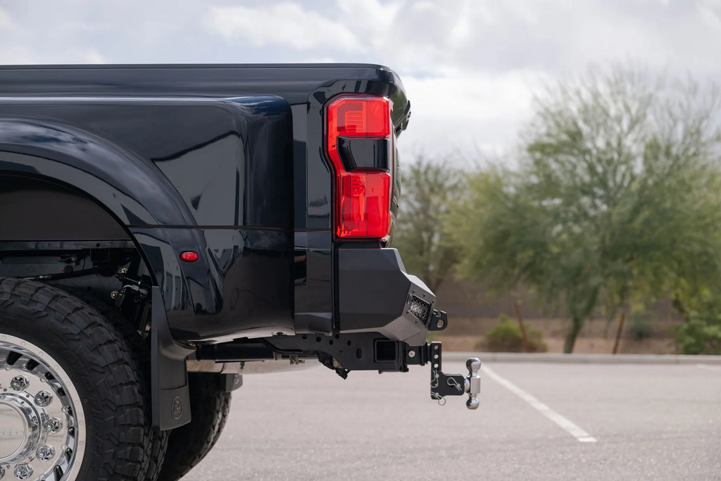Our Honeybadger Rear Bumper for the 2023+ Ford Super Duty F-250/350/450 delivers aggressive styling, functional lighting integration, and durable rear-end protection while maintaining full factory functionality. This bumper enhances both appearance and capability without compromising OEM safety systems.