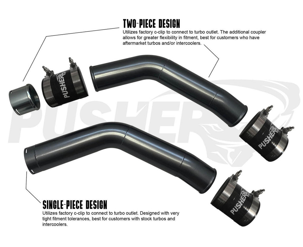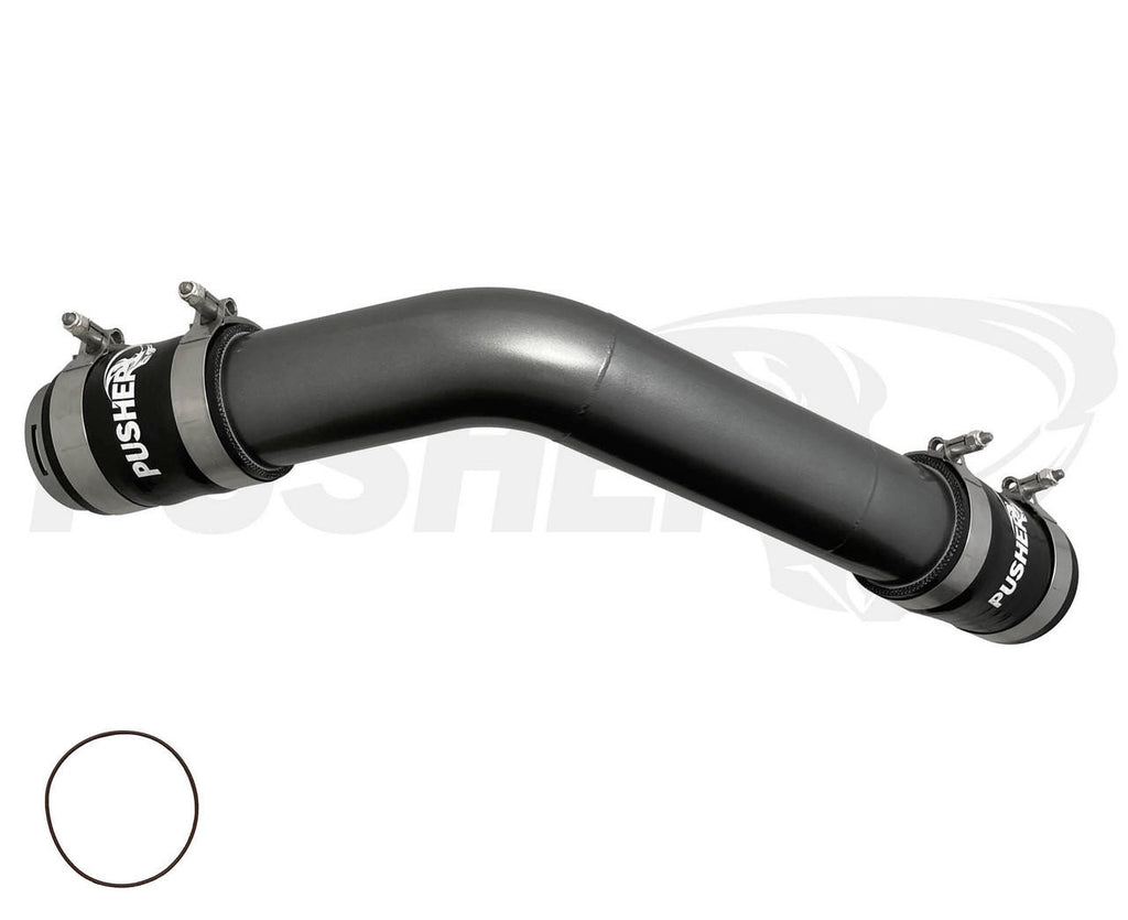 The Pusher HD 3" Hot Side Charge Tube for the 2015+ Ford F250/350 6.7L Powerstroke replaces the restrictive factory hot side charge tube and its failure prone couplers with a fully TIG welded, mandrel bent, CNC machined steel charge tube and heavy duty silicone coupler with full stainless T-bolt clamps.